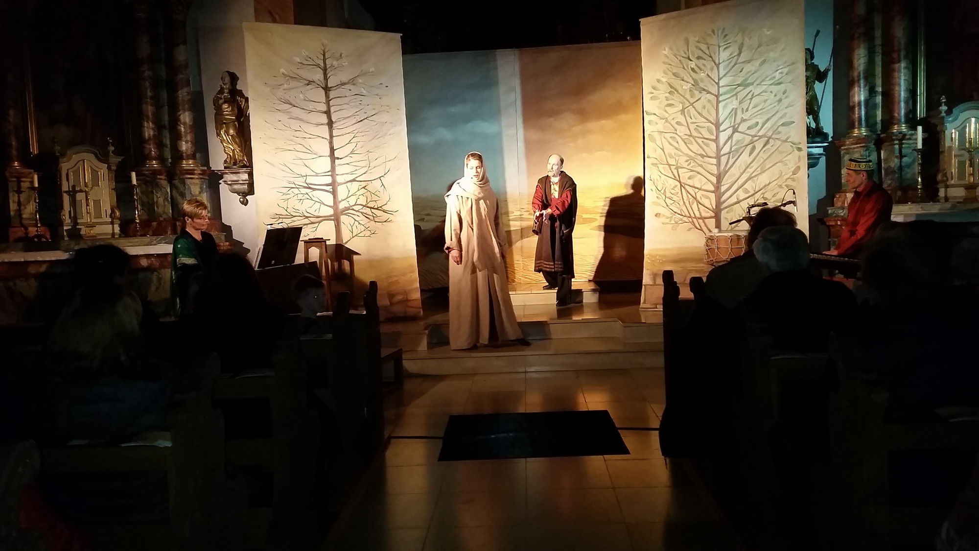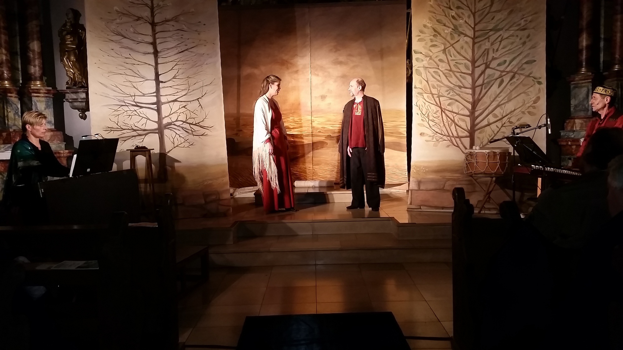 „Wer ist es, die da herabschaut“, fragte Salomo (Hubertus von Krosigk) mit der Schriftrolle in der Hand. Dazu sang er hebräisch „Uri tsafon“ aus dem Hohe Lied. Sulamith (Friedrike von Krosigk) näherte sich ihm und reichte eine Schale mit Wein und Trauben. Salomo schreibt imaginär mit einer Feder in die Luft und preist ihre Schönheit. Sie singt „Lamma bada“, traditionell arabisch. Rainer Schwander untermalte die Gesänge und Texte mit seinem vielseitigen Instrumentarium aus Sopransaxophon, Querflöte, Gemshorn und verschiedenen Percussion-Instrumenten. Tanz und Liebesgeflüster, dann verschwindet das Paar hinter dem Gemälde, wo Schattenumrisse das Liebesspiel vermuten lassen. „Ich suchte ihn, aber ich fand ihn nicht“, rezitierte Sulamith und ließ dazu die Kastagnetten klappern, als Salomo verschwunden ist, toll vom Spiel am Klavier begleitet. Sie beschwört die Töchter Jerusalems, dass sie ihrem Geliebten, wenn sie ihn finden, sagen sollen, dass sie krank vor Liebe ist. Mit „Rabbi Montenyu“ erklang traditionelle Klezmermusik. Sehr ausdrucksvoll waren „Improvisation für Gemshorn und Orgel“ und die „Sarabande in e-moll“ mit Eva Gerlach und Rainer Schwander. Hinter der Wand deklamierte Hubertus von Krosigk den Prediger Salomo im 3. Kapitel des Alten Testaments. „Alles hat seine Zeit, geboren werden und sterben, pflanzen und ausreißen, töten und heil werden, suchen und finden, schweigen und reden, und hassen und lieben“. Weitere Texte der christlichen Mystikerin Mechtild von Magdeburg, ein Liebeslied von Rainer Maria Rilke und der Text des islamischen Mystikers Djalaluddin Rumi „Ergreife den Saum seiner Gnade, weil er dir im Nu entflieht“ ergänzten das Spiel. Auch ein modernes Lied war zu hören. „Du, Du, Du“ nach André Heller sprach natürlich auch von der Liebe. Dann entrollten die beiden Liebenden eine Schriftrolle über den gesamten Mittelgang. „Die Liebe erträgt alles, sie glaubt alles, sie hofft alles, sie duldet alles. Die Liebe höret niemals auf“ stand darauf in großen Lettern das Hohe Lied der Liebe aus dem 1. Korintherbrief des Apostels Paulus. Mit der Salsa Morgana setzten Eva Gerlachund Rainer Schwander einen starken Schlusspunkt. Der verdunkelte Kirchenraum irritierte zunächst, bis das Publikum das Ende der Aufführung realisierte. Starker Applaus belohnte die Mitglieder des Ensembles für ihr intensives Spiel. Der Spagat zwischen den Jahrtausende alten Liedern und Liedern der Neuzeit ist gelungen.
