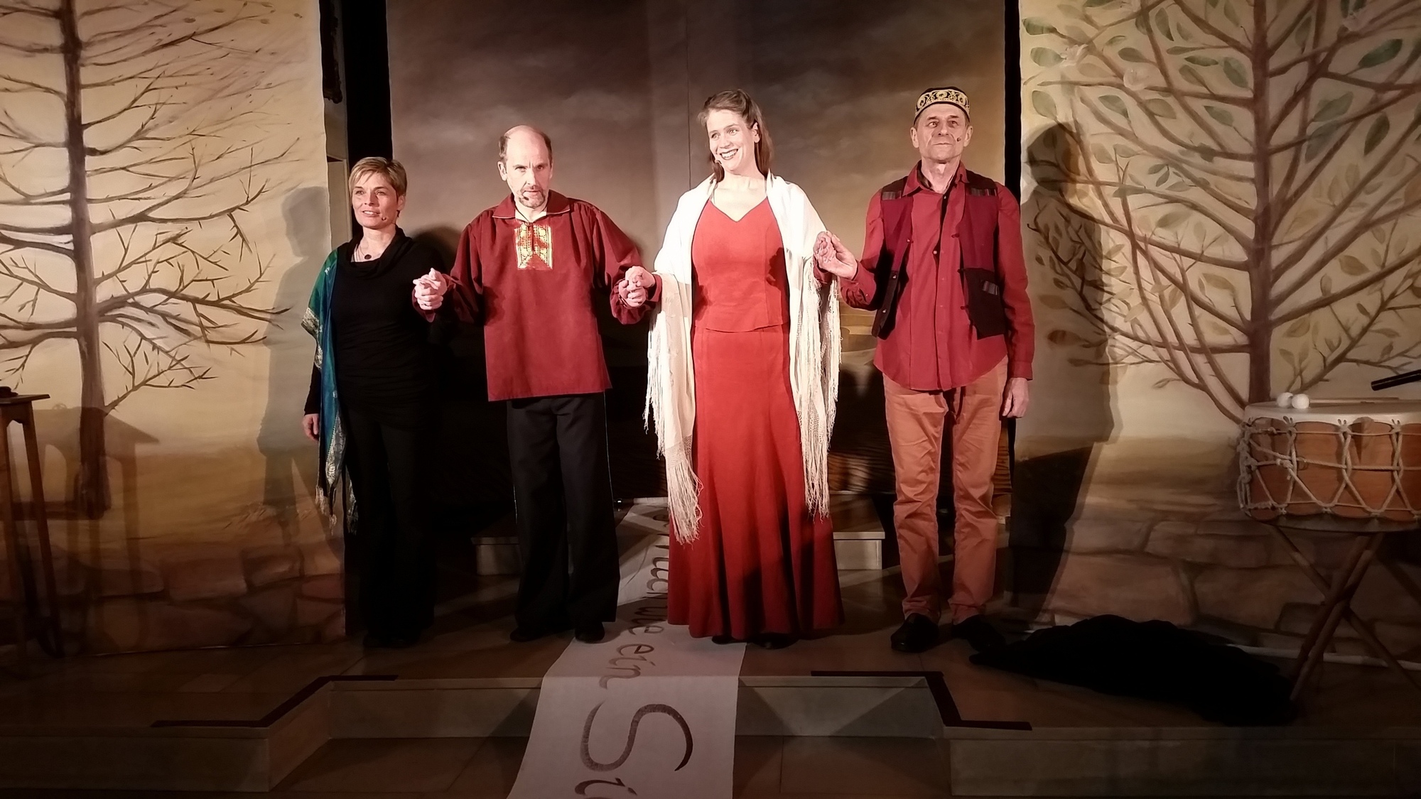 Dieses Stück ist Menschen, die die Bibel lesen oder kennenlernen möchten, gewidmet. Es wird eine Geschichte erzählt, die heute geschehen könnte zwischen Mann und Frau. Es werden Fragen an die Liebe gestellt, an die erste Liebe, die körperliche Liebe, die verlorene Liebe, die sinnlose und schmerzhafte, aber auch die Liebe zu Gott und die allumfassende Liebe. Nikoline F. Kruse hat mit der Wüste als Hintergrund ein Bühnenbild-Gemälde geschaffen, das das sanfte Eintauchen in die Weite der Mystik tiefer spüren lässt. Rechts und links davon stehen Bäume, die die Jahreszeiten der Liebe andeuten. Das Hohelied Salomos ist im Alten Testament und im jüdischen Tanach zu finden und ist eine Sammlung zärtlicher, teilweise erotischer Liebeslieder, die das Suchen und Finden, das Sehnen und gegenseitige Lobpreisen zweier Liebender schildert. Das Ensemble Theatrum hat das exzellent umgesetzt.