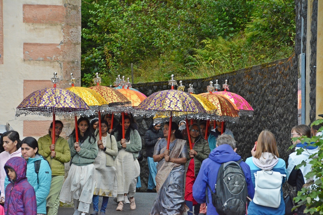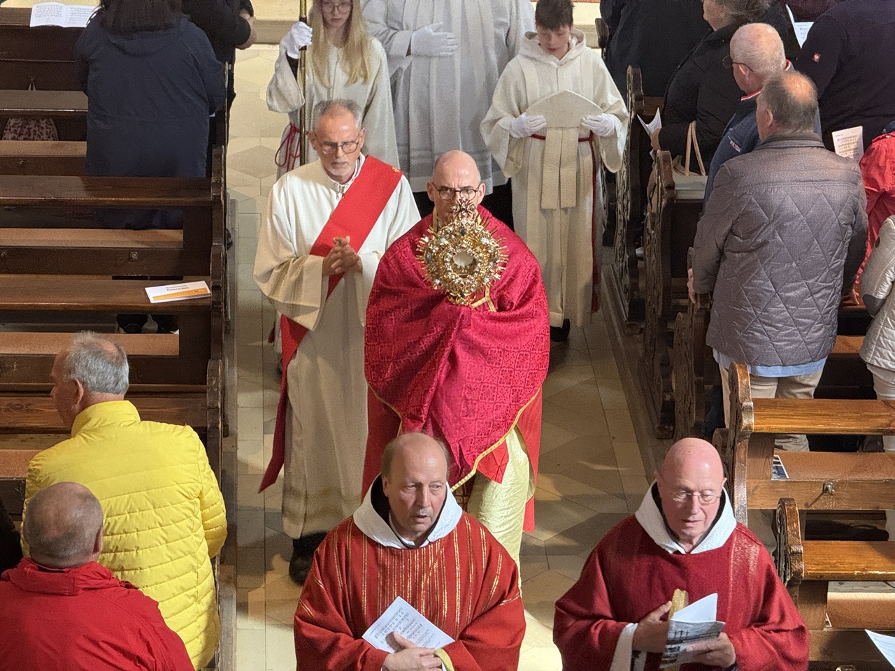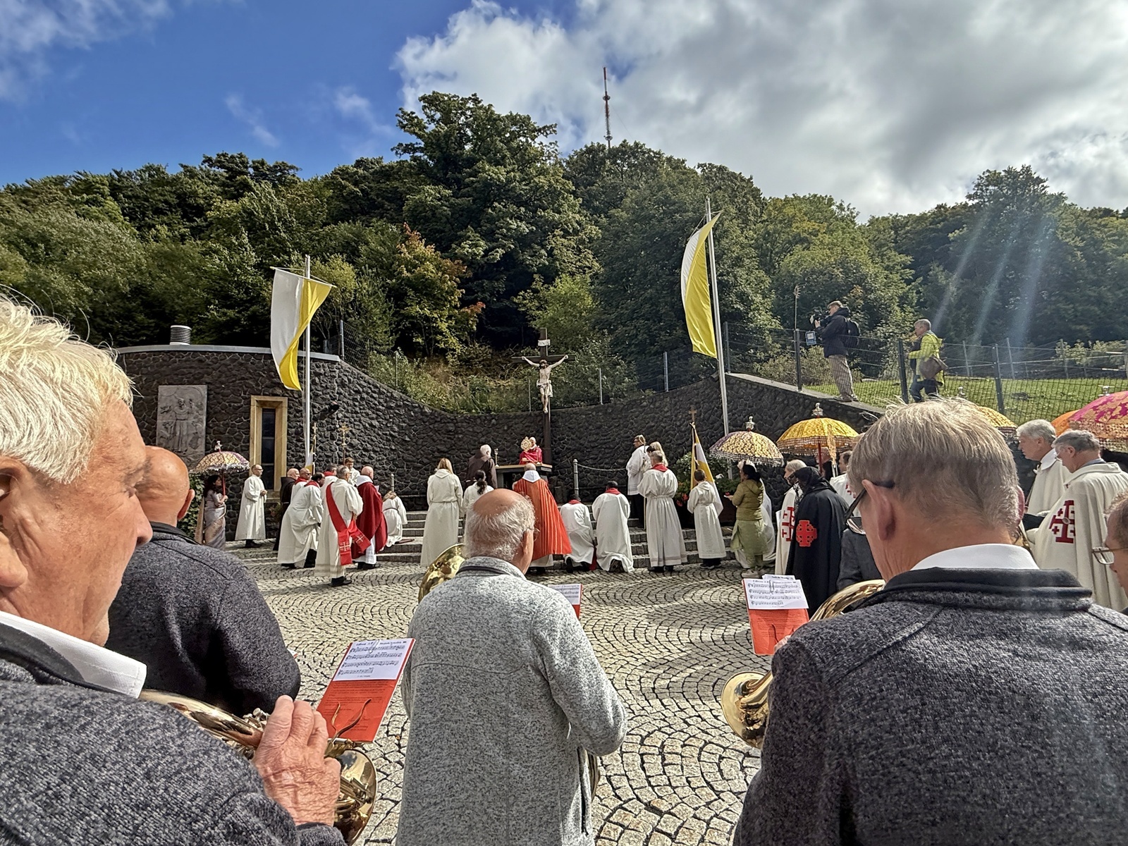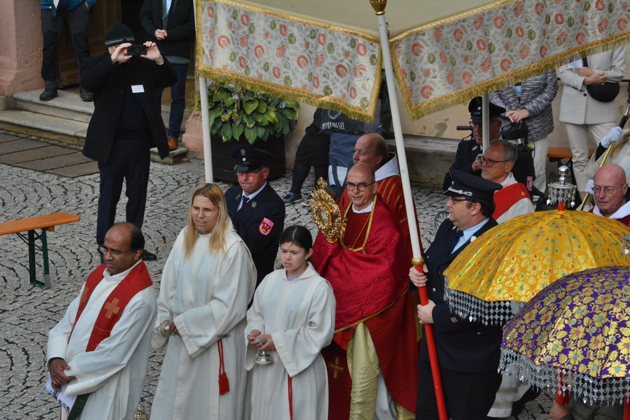 Kreuzberg (hf). Dunkle Wolken und Regenschauer ließen zu Beginn des Festgottesdienstes in der Klosterkirche am Kreuzberg am Sonntagmorgen kaum Hoffnung auf die traditionelle Eucharistische Prozession mit dem Würzburger Bischof Franz Jung. Doch dann zeigte sich teils blauer Himmel und Sonnenschein. Für Joachim Markert, Leiter des Diözesanbüros Bad Neustadt war das nicht einfach nur „Glück mit dem Wetter“, sondern „Gottvertrauen“. So begleiteten denn auch zahlreiche Gläubige, Priester aus der Rhön, darunter Generalvikar Jürgen Vorndran, Mitglieder des „der Ritterordens vom Heiligen Grabesritter zu Jerusalem“, sowie die indische Gemeinde, Bischof Franz Jung mit der Monstranz bei der Prozession. Der abschließende eucharistische Segen am Freialtar war traditionell der Abschluß des Festes zur „Kreuzerhöhung“.