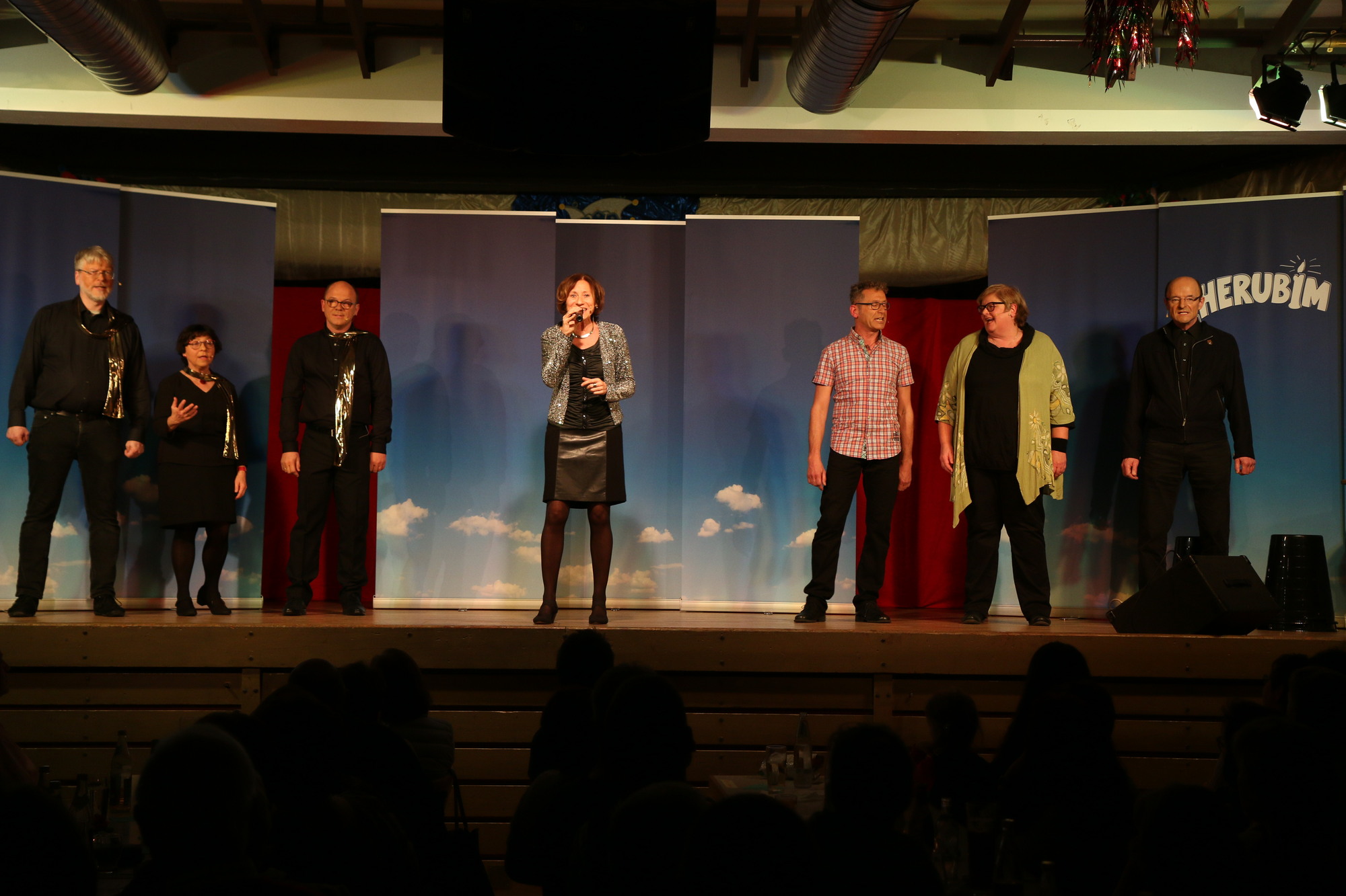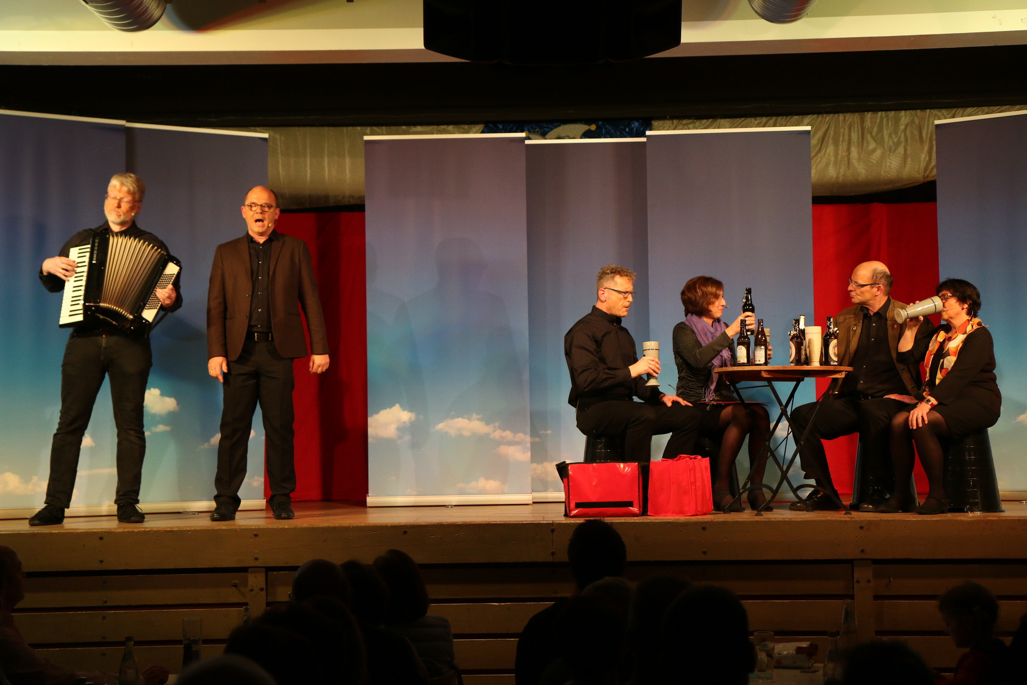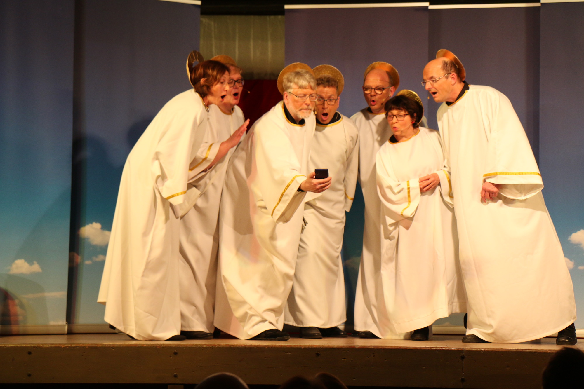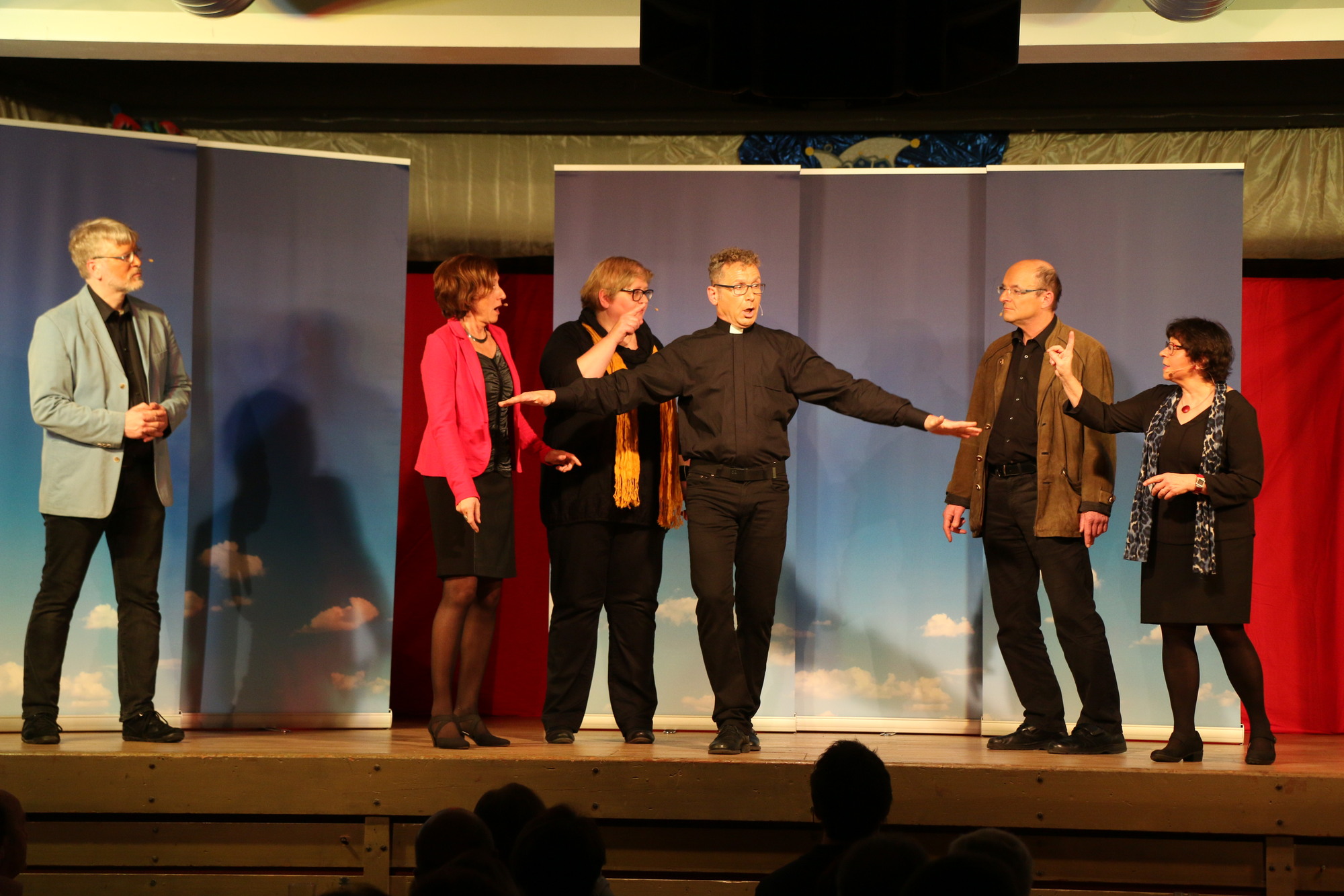 „Wenn es eine Ehe für all gibt“, so fragten sich die Kabarettisten, die seit 30 Jahren auf der Bühne stehen, „müssen dann Bischöfe auch heiraten?“. Eine Steilvorlage gab Lothar de Maizieres Vorschlag, einen muslimischen Feiertag einzuführen. In einer amüsanten Diskussion kamen sie zu dem Ergebnis, dass 90 Feiertag im Jahr zustande kämen, wenn alle Festtage der verschiedenen Religionen gefeiert werden würden. Das Flüchtlingsthema hatte bei den Akteuren genauso seinen Platz wie die Überlastung der Pfarrer und das Lutherjahr. Welche Widerstände eine konfessionsverschiedene Ehe in der Vergangenheit hatte, zeigten Maria Schmid und Michael Moser auf und Gabi Michelfeit versuchte mit dem Blick in die Glaskugel festzustellen, wie es mit der „Pastoral der Zukunft“ weitergehe. Selbst ernste Themen, wie das Sterben und die Missbrauchsskandale in der Kirche, ließ „Cherubim“ nicht aus. Breiten Raum nahm die Vakanz des Bischofsstuhls in Würzburg ein. Während eine Zusammenlegung aller sieben bayerischen Diözesen zu einer Großdiözese von den sieben Nebenberufskabarettisten nicht ausgeschlossen wurde, versuchten sie sich mit den verschiedensten Methoden diesem Thema zu nähern. Aber sowohl die „Reise nach Jerusalem“ als auch ein Quartettspiel mussten die in Engelskostüme geschlüpften Akteure verwerfen. Nachdem sie dem Heiligen Geist keinen Rat für einen neuen Bischof geben konnten, kam der Vorschlag: „Jetzt regiert das Volk“ und ein passender Text auf Wolfgang Petrys Song „So ein Wahnsinn“, schloss den Part ab.