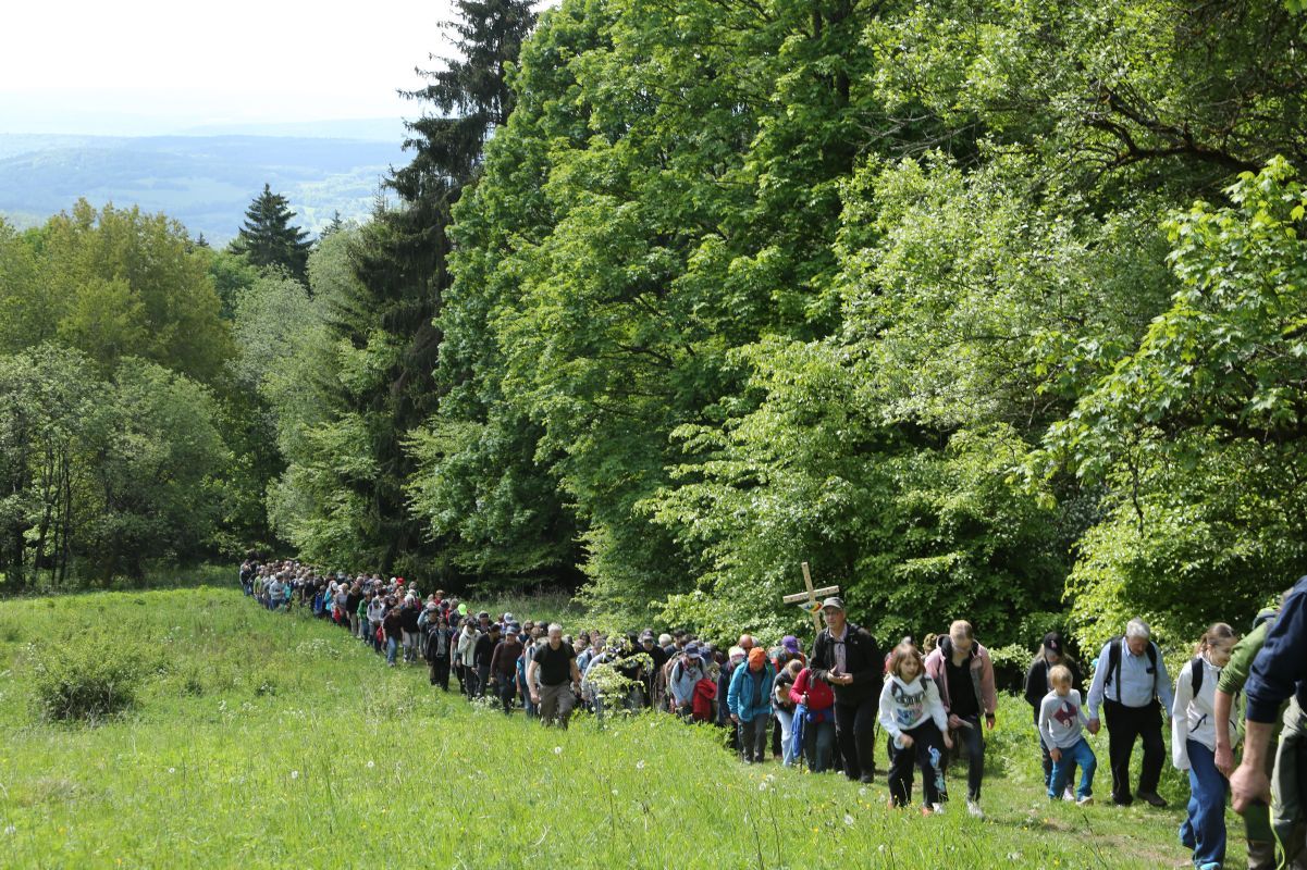 Kloster Kreuzberg (POW) Ausgestattet mit Wanderschuhen, Rucksäcken und Spazierstöcken sind am Samstag, 17. Mai, zirka 400 Pilgerinnen und Pilger zur ökumenischen Kreuzbergwallfahrt aufgebrochen. Vom Wanderparkplatz in Sandberg ging es hinauf zur Klosterkirche auf dem Kreuzberg, dem heiligen Berg der Franken. Gemeinsam mit Bischof Dr. Franz Jung und Regionalbischöfin Gisela Bornowski begann die Gruppe den gemeinsamen Tag mit dem Lied „Morgenstern leuchtet“. Bischof Jung und Regionalbischöfin Bornowski eröffneten die Wallfahrt, die unter dem Motto „Gemeinsam unterwegs als Pilger der Hoffnung“ stand. „Hoffnung ist nicht nur eine Haltung, sondern ein Weg, den man geht“, sagte Bischof Jung. Es gehe bei der Wallfahrt darum, „immer nach vorne zu schauen und zu wissen, dass Gott mit uns geht durch die Höhen und Tiefen“. Auch Regionalbischöfin Bornowski begrüßte die Gruppe: „Man sagt: Wenn man auf den Berg steigt, kommt man anders runter als man hochgestiegen ist.“ Die Wallfahrt könne die Gläubigen in ihrer Hoffnung stärken.